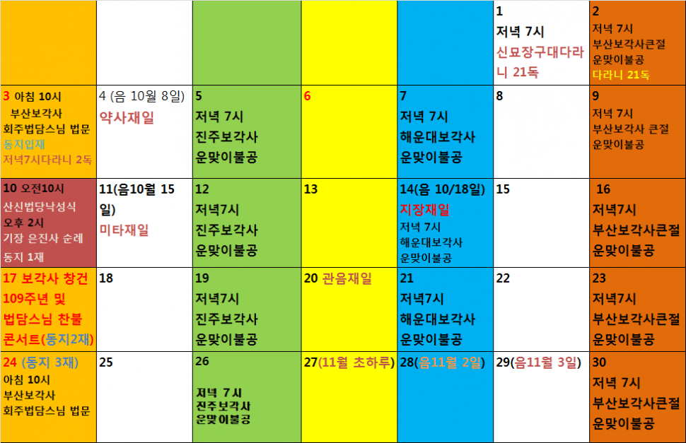 불기 2563년 서기 2019년 11월 보각사 기도법회 일정표