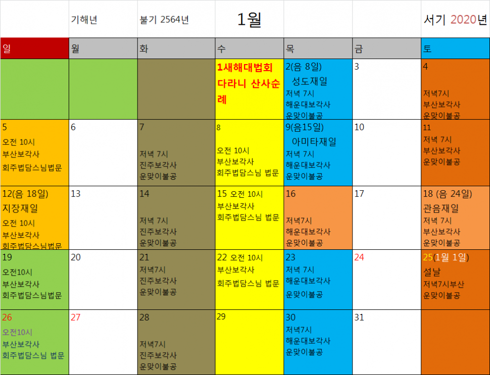 불기 2564년 양력 1월 기도법회 일정표