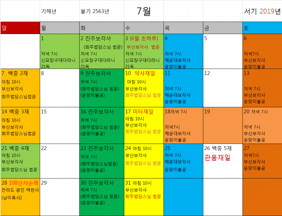 2019년 7월 보각사 기도 법회 일정표